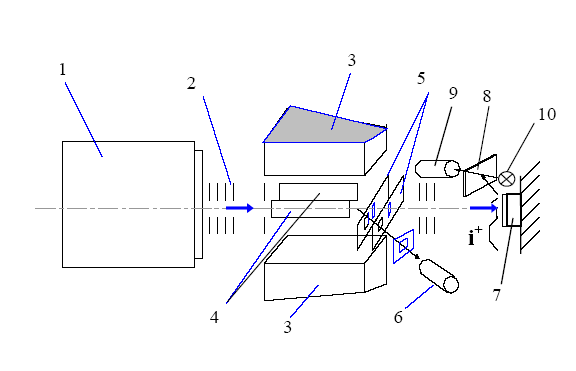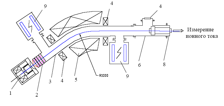 Рисунок 2 – Схема установки типа " Массмонохроматор": 1 – источник ионов, 2 – ускорительная секция, 3 – вакуумопровод, 4 – электромагнитная фокусирующая линза, 5 – обмотки электромагнита массмонохроматора, 6 – рабочая камера, 7 – оптический ввод, 8 – фланец с держателем образца, 9 – высоковакуумные насосы. Изучение закономерностей распыления материалов при облучении полиэнергетическим пучком ионов проводится на установке ВОКАЛ (рис. 3). Как видно из рисунка, установка состоит из источника ионов, ускорительной трубки, фильтра энергии и масс ионов (образуют электроды- и полюсные наконечники электромагнитов-), держателя образца. Для определения параметров пучка используется поворотный электромагнит- с детектором типа цилиндра Фарадея. В процессе облучения мишени пучком ионов часть распылившихся атомов осаждается на специальный прозрачный коллектор, в результате чего его прозрачность уменьшается. Это приводит к снижению освещенности фотодиода и уменьшению фототока. Таки образом методом фотометрирования можно определять не только количество распылившихся атомов, но и получать зависимость количества распылившихся атомов от времени облучения (т.е. от дозы облучения).