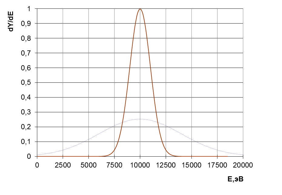 Рисунок 4 - Зависимость коэффициента распыления от энергии налетающих частиц Ar+. Коэффициент распыления для полиэнергетического пучка определялся по формуле: Sp(< E>)= (интервал был разделен на 60 частей, причем DE=250 эВ) Из рис. 4 видно, что типичные энергетические спектры ионов в пучке представляют собой куполообразную зависимость. Как показал эксперимент по изучению радиационной эрозии материалов, наблюдаются отличия в протекании этих процессов при облучении полиэнергетическим пучком ионов (рис. 5), которые обусловлены особенностями энерговыделения и градиента внутренних напряжений в приповерхностных слоях облучаемых материалов по сравнению с облучением моноэнергетическим пучком тех же ионов.