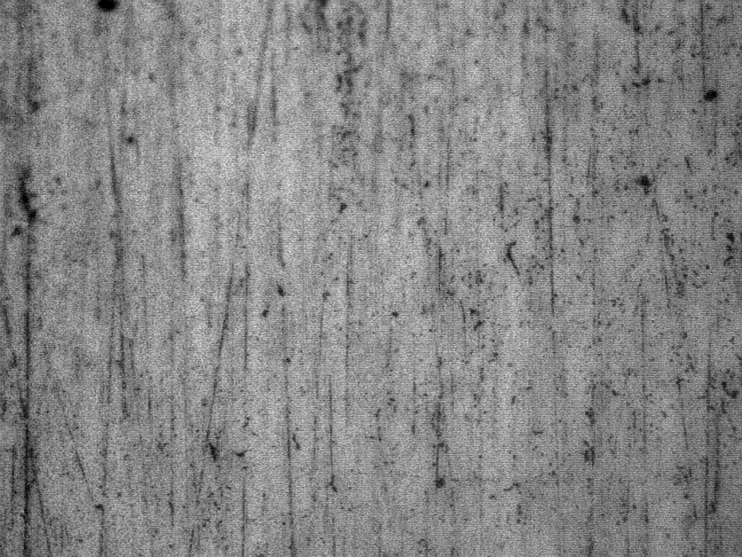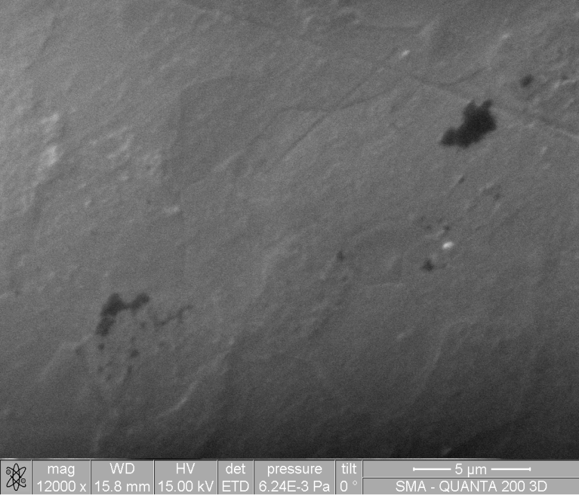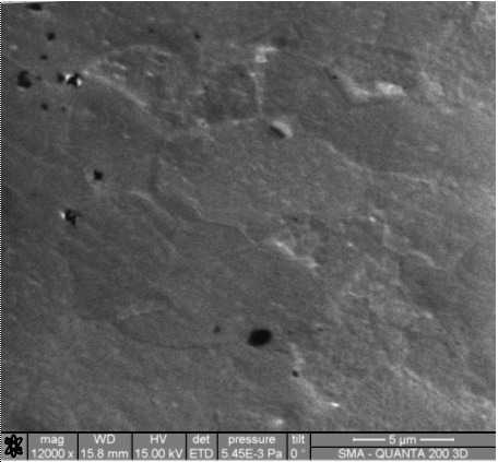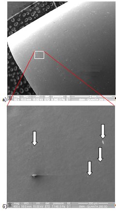 а) б) Рисунок 6 – Структура поверхности исходного образца меди в полированном состоянии (а) и после распыления полиэнергетическим пучком ионов со средней энергией 10 кэВ (б). Масса исходного образца m1 = 0, 63121г; Масса распыленного образца m2 = 0, 62616г; Изменение массы Δ m = 0, 00505г; Время облучения t = 30 мин = 1800 с; Плотность потока пучка j = 6, 3·1015 ион/см2·с; Коэффициент распыления =