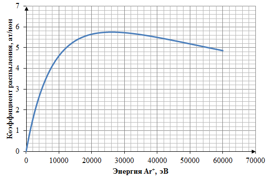 Полученная зависимость коэффициента распыления от энергии налетающих частиц Ar+ представлена на рисунке 4.
