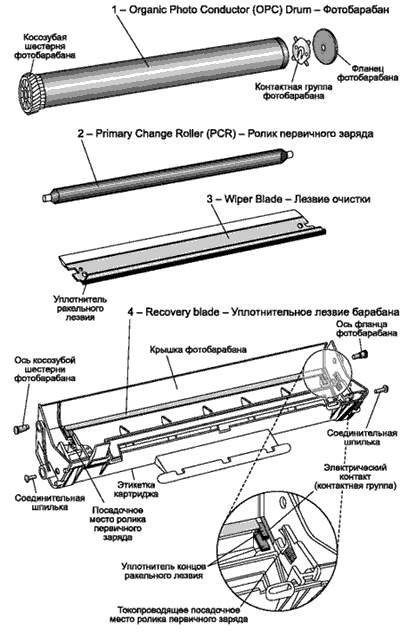 Основные конструктивные элементы отделения для отработанного тонера: 1 – Фотобарабан (Organic Photo Conductor (OPCJ Drum). Представляет собой алюминиевый цилиндр, покрытый органическим светочувствительным и фотопроводящим материалом (обычно оксидом цинка), который способен сохранять образ, наносимый лазерным лучом; 2 – Вал первичного заряда (Primary Charge Roller (PCR)), Обеспечивает равномерный отрицательный заряд барабана. Выполнен из токопроводящей резиновой или поролоновой основы, нанесенной на металлический вал; 3 - «Вайпер», ракель, чистящее лезвие (Wiper Blade, Cleaning Blade). Очищает барабан от остатков тонера, который не был перенесен на бумагу. Конструктивно выполнен в виде металлического каркаса (stamping) с полиуретановой пластиной (blade) на конце; 4 – Лезвие очистки (Recovery Blade). Перекрывает область между барабаном и бункером для отработанного тонера. Recovery Blade пропускает тонер, оставшийся на барабане, внутрь бункера и не дает ему высыпаться в обратном направлении (из бункера на бумагу). Основные конструктивные элементы тонерного отсека: