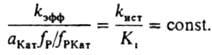 где (kист)i - элементарная константа скорости по i-му маршруту, а* и f* - относятся к активир. комплексу. Из опытных данных следует, что множитель fРК/f* не изменяется при варьировании сКат и его приравнивают к единице. В растворе с постоянной сКат наблюдаемая скорость реакции