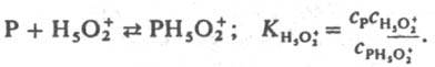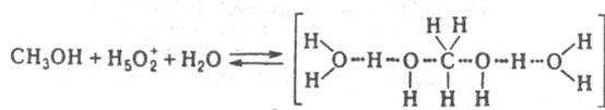 Ф-ции h0, h0аH2O и h0а2H2O стандартизованы к воде, и в сильно разбавленных растворах сильных кислот они численно равны концентрации ионов Н5О+2 в моль/л. В таких растворах для приведенных выше реакций при варьировании сKaтдолжно соблюдаться постоянство значений kэфф/cH2O+. При гидролизе некоторых амидов, анилидов, сложных эфиров kэфф/cH2O+ постоянно не только в разбавленных, но и в конц. водный растворах НСlO4, H2SO4. Если гидролиз протекает по схеме (1), то реакционноспособный комплекс образуется из реагента и иона Н5О2+, а выраженная в концентрацияхконстанта равновесия KH5O2+; не изменяется при варьировании сКат: