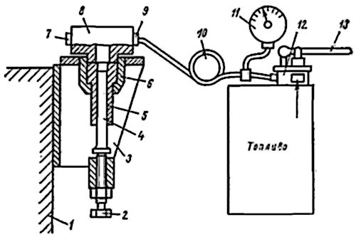 Рис. 4. Схема установки для испытания плунжерных пар при переменном давлении топлива. При испытании форсуночным прессом с помощью рукоятки 13 создается некоторое начальное давление р1 которое фиксируется манометром 11. Прекратив нагнетание рукояткой, наблюдают за падением давления до р2. Перепад Δ р = р1 ÷ р2 берут в пределах 10 - 20 МПа, а границы давления р1 = 90 ÷ 50 МПа, р2 = 60 ÷ 40 МПа. Время падения давления зависит от диаметра плунжера, начального давления и вязкости топлива. Если время неизвестно, то его следует определить, испытав новую плунжерную пару на стандартном топливе. Давление р1 устанавливают исходя из возможностей пресса. Перед испытаниями форсуночным прессом убеждаются в его достаточной герметичности. Для этого служит выходное отверстие. Повысив давление до 35 МПа, не спуская рукоятки, наблюдают за падением давления, которое за 10 мин должно упасть не более чем на 1, 0 — 1, 5 МПа. Клапаны насосов высокого давления также могут быть испытаны на герметичность с помощью форсуночного пресса.
