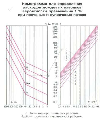 Одновременно с проектированием плана и профиля производится размещение малых водопропускных сооружений в местах пересечения трассой периодических водотоков. Для этого на профиле в пониженных местах (за исключением седловин) размещают водопропускные сооружения. Для расчета ливневого стока Q можно использовать приближенный метод. Расход ливневого стока Qн 1%-ой вероятности превышения для бассейнов с песчаным и супесчаными почвами определяется в функции площади бассейна F и уклона главного лога бассейна J по номограмме Рис. 1. Ливневый район 6, III группа климатических районов.
