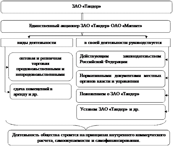Организационно-экономическая характеристика деятельности ЗАО «Тандер» Компания «Тандер» была образована в январе 1994 года в г. Краснодаре. Бизнес начинался с оптовых продаж небольшого ассортимента парфюмерии, косметики и бытовой химии. Для достижения быстрой оборачиваемости, фирма активно продвигала товар через собственную розничную сеть, насчитывавшую к 1996 г. более 30 торговых точек в г. Краснодаре и других населенных пунктах края. Параллельно процессу создания собственной розничной сети, шел процесс становления компании как дистрибьютора ведущих мировых производителей в данной товарной группе. Летом 1995 г. началось формирование филиалов фирмы на Юге России: 1995 год: г. Сочи; г. Ставрополь; г. Пятигорск; 1996 год: г. Волгоград; г. Новороссийск; г. Армавир; г. Саратов; 1997 год: г. Нижний Новгород; г. Ростов-на-Дону. К концу 1996 г. фирма «Тандер» прочно заняла место в десятке крупнейших российских фирм-дистрибьюторов парфюмерии, косметики и бытовой химии, и это позволило нам отказаться от собственных розничных точек и направить усилия на развитие технологий дистрибьюторского бизнеса. К апрелю 1997 г. была сформулирована концепция развития компании «Тандер» как grossery-дистрибьютора, и мы приступили к освоению нового для нас продовольственного сегмента рынка. Весной 1998 г. «Тандер» приступил к практической реализации идей дистрибьюции в области товародвижения. Южные филиалы были переведены со складской системы работы, на систему «кросс-док». Августовский кризис 1998 г., нанесший серьезный удар по всей экономике страны, на некоторое время замедлил развитие фирмы, и она была вынуждена закрыть Нижегородский филиал. В то же время, в период кризиса за короткий временной отрезок компания произвела полную реструктуризацию деятельности, перешли на новейшие формы и технологии работы, что позволило к августу 1999 г. достичь докризисных объемов продаж. В 1998 г. начата работа по освоению дополнительного сегмента рынка, в г. Краснодаре был открыт первый магазин формата «Кэш& Кери». В 1999 г. такие магазины открылись и в других филиалах компании. Однако, анализируя их работу, руководство пришло к выводу, что формат «C& C» не вполне соответствует актуальным потребностям рынка и приняло решение об изменении некоторых принципов работы наших магазинов. В 2000 г. все работающие на тот момент магазины были преобразованы в дискаунтеры. Сеть магазинов дискаунтеров получила название «Магнит» и под этим названием продолжила свой количественный и качественный рост. В 2001 г. сеть «Магнит» стала крупнейшей розничной сетью в России. В 1999 г. «Тандер» прирос еще на 2 филиала, Московский и Санкт-Петербургский. В 2000 г. создано более двадцати представительств в областных и районных городах России, при этом большая часть из них открыта в Поволжье. В 2002 г. открыты филиалы в Воронеже, Липецке, Орле и Белгороде. За период 2002-2006 гг. было открыто 24 филиала, компания приросла еще на 1556 магазинов, которые в настоящее время успешно развиваются. В 2004 г. компания начала работу по размещению акций на фондовом рынке. Цель - привлечь денежные средства для дальнейшего развития компании. Благодаря продаже акций привлекаются денежные средства, которые используются для покупки и строительства новых помещений для магазинов «Магнит», транспорта, оборудования и т. д. В 2006 г. состоялось первичное размеще