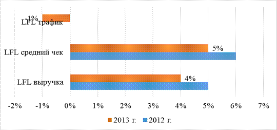 По состоянию на 31 декабря 2013 г. общая численность сотрудников группы компаний «Магнит» составила 217258 человек. На основании данных, полученных из открытых источников, менеджмент компании предполагает, что ОАО «Магнит» является крупнейшим частным работодателем в России. Рост сопоставимых продаж 2013 г. к 2012 г. в рублевом выражении составил 3, 88%, средний чек вырос на 5, 22%, трафик сократился на 1, 28% (рис. 10).