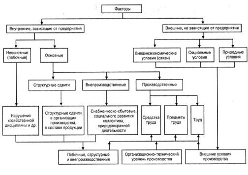 Эффективность хозяйственной деятельности характеризуется сравнительно небольшим кругом показателей. Но на каждый такой показатель оказывает влияние целая система факторов. От объективно обусловленных факторов надо отличать субъективные пути воздействия на показатели, т.е. возможные организационно-технические мероприятия, с помощью которых можно воздействовать на факторы, определяющие данный показатель. Факторы в экономическом анализе могут классифицироваться по различным признакам. Так, факторы могут быть общими, т.е. влияющими на ряд показателей, или частными, специфическими для данного показателя. Обобщающий характер многих факторов объясняется связью и взаимной обусловленностью, которые существуют между отдельными показателями. Внутренними основными называются факторы, теоретически определяющие результаты работы предприятия. Внутренние не основные факторы хотя и влияют на обобщающие показатели, но не связаны непосредственно с сущностью рассматриваемого показателя, например нарушения хозяйственной и технологической дисциплины. Внешние факторы не зависят от деятельности предприятия, но количественно определяют уровень использования производственных и финансовых ресурсов данного предприятия.