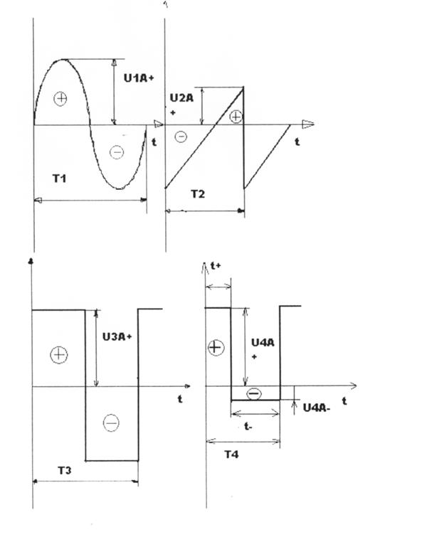 Если вход детектора открытый, то на детектирование (следовательно, и на измерение) проходит все входное напряжение uдеm(t)=u(t). Если же входдетектора закрытый, то на детектирование проходит только переменная составляющая входного напряжения uдеm(t)= u(t)-u0= u'(t), и отсчет α (или α А) зависит только от переменной составляющей, которая определяет величину выходного тока детектора. На рис.3 показаны формы широко используемых несинусоидальных напряжений.