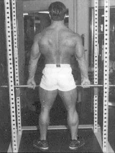 Исходная позиция для становой тяги с верхнего положения. Гриф был снят с ограничителей, установленных на высоте середины бедра. Затем атлет отошел назад на минимальное расстояние, достаточное лишь для того, чтобы вертикальные стойки рамы не мешали выполнять тягу. Возможно, Вашим слабым место окажется хват, если Вы сразу попытаетесь делать такую тягу с большими весами. Но если Вы будете увеличивать свои веса постепенно и если Вы будете держать штангу между ладонью и пальцами, а не только пальцами, и если Вы будете использовать мел, и если Вы уделите самое серьезное внимание развитию силы хвата с помощью толстого грифа в течение нескольких месяцев, и если Вы будете избегать большого количества повторений, то хват перестанет быть Вашим слабым местом. Чтобы держать гриф не только ладонью, но и пальцами, поместите его на середину ладони, прежде чем обхватывать его пальцами. Если Вы обхватываете гриф, когда он находится в основании Ваших пальцев, то хват будет слабым. Такая техника выполнения становой тяги " с верхнего положения" особенно подходит для трэп-грифа, потому что такая техника превращает тягу в более эффективное упражнение. Вне зависимости от того, каким грифом Вы пользуетесь, обращайте особое внимание на то, чтобы штанга опускалась вниз по правильной траектории. Никогда не относитесь к опусканию штанги несерьезно. Но если Вы все же " потеряете" траекторию при опускании штанги, поставьте ее на пол и встаньте в правильную позицию перед тем, как поднимать штангу в очередной раз. Несмотря на то, что выполнение становой тяги в таком варианте не предусматривает паузы внизу, лучше, все же, нарушить это правило, чем сбиться с траектории и рисковать получением травмы при подъеме штанги в следующем повторении. Одним из самых больших преимуществ выполнения каждого повторения тяги с пола является возможность корректировать положение ног и грифа. Распрямившись между повторениями, со штангой на полу, Вы можете поправить положение ног или грифа так, чтобы следующее повторение Вы начали с идеальной техникой. Кроме того, это уменьшит компрессию Вашего позвоночника, т.к. не будет паузы в верхнем положении, когда Вы держите вес в руках. Еще одним преимуществом варианта выполнения становой тяги с пола является то обстоятельство, что Вы можете использовать больший вес.