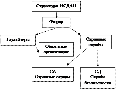 Националистические и леворадикальные устремления одновременно дали толчок к появлению влиятельной партии фашистского типа - Национал-социалистической рабочей партии Германии. Программа НСДАП (1926) предполагала существенную социализацию экономики: уничтожения нетрудовых доходов, огосударствления крупных монополий, укрепления государственного регулирования, конфискацию военных прибылей, создания «корпоративного производства». Важную роль в программе занимала аграрная реформа, которая предусматривала наделение крестьян землей за счет безвозмездных конфискаций у дворянства и, главным образом, богатых евреев-собственников. Программа НСДАП негативно относилась к либеральным парламентским институтам. Последняя, наряду с социальной экономической программой, вызывала особую поддержку рабочей массы (по своему социальному составу НСДАП на 45% была рабочей партией). Успеху НСДАП способствовала четкая организационная структура. установленная 1921г. Руководители ячеек назначались гаулейтерами (руководителями областных организаций), партия проводила ежегодные съезды, которые пр5евращались в массовые политические манифестации. С1921г. в Партии стали формироваться особые «охранные отряды» (СА), с 1925 г. – параллельная военная структура «охранные эскадроны» (СС). После бунта СА, вызванного партийной коррупцией, появился ещё один вид (военизировано-полицейских подразделений – «служба безопасности» (СД). Ориентирование на военные методы вызывало широкую поддержку(1928г.) НСДАП у военных. Охранные службы партии стали использоваться правительствами земель в полицейских целях. К началу 1930г. партия сложилась в мощную самостоятельную политическую силу, за которую голосовали не менее трети избирателей, «очарованных» социализированной программой.