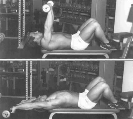 " Дыхательный" пуловер, предназначенный Цель этого упражнения заключается лишь в растяжке и в форсировании дыхания. Начните всего лишь с 5-8 кг - с короткого и пустого грифа, с пары очень легких гантелей, одной гантели или просто с одного блина от штанги. (На тренажере " дыхательные" пуловеры делать невозможно.) Через пару месяцев Вы можете увеличить нагрузку до 8-10 кг, но увеличивать дальше не стоит, разве что Ваш жим лежа равняется 115 кг. В этом случае Вы можете увеличить нагрузку до 11 кг. Когда Ваш жим станет равным 135 кг, делайте пуловер с 14 кг. Не превышайте указанные цифры - в " дыхательном" пуловере не нужно прогрессивно наращивать нагрузку. Если будете использовать тяжелые веса в этом виде пуловера, то упражнение потеряет свою эффективность, кроме того, возрастет риск травмы плечевых суставов. Если сомневаетесь, какой вес взять для этого упражнения, берите тот, что легче. Держа отягощение в руках, лягте на скамью - вдоль, а не поперек. Ноги поставьте на скамью. Это предотвратит излишнее выгибание спины и излишнее растягивание брюшной стенки. Держите отягощение на вытянутых руках над верхней частью груди. Хват должен быть на ширине плеч или уже, если Вы используете одну гантелю или один блин от штанги. На протяжении всего упражнения держите руки зафиксированными в локтях, медленно опустите гриф за голову и одновременно сделайте вдох как можно глубже. Сделайте не просто один большой глоток воздуха, а наполняйте грудную клетку постоянным потоком воздуха. Распрямите как можно больше ребра. Опускайте руки вниз до параллельной к полу позиции или чуть ниже этой точки. Не нужно опускать вес как можно ниже. В нижней безопасной точке сделайте еще один дополнительный глоток воздуха. Сделайте кратковременную паузу и затем возвратите руки в исходную позицию, одновременно выдыхая. Сделайте как минимум 15 медленных повторений. Считать повторения не нужно. Просто продолжайте делать упражнение в течение некоторого времени, сосредотачиваясь на растяжении своей грудной клетки. Поэкспериментируйте с разными положениями тела. Делайте то же упражнение, но свесьте немного голову со скамьи, как показано на фото. Вы можете тем самым увеличить эффект упражнения на грудную клетку по сравнению с тем вариантом пуловера, когда голова полностью лежит на скамье. Упражнение также можно делать и на полу. Хотя такой вариант несколько уменьшит амплитуду, он может быть очень эффективным. Именно так делали это упражнение в старые добрые времена, задолго до того, как скамьи для жимов стали обязательным атрибутом спортивных залов. Если руки держать полностью выпрямленными в локтях, то это может привести к проблемам с локтевыми суставами. Если Вы ощущаете дискомфорт в локтях, то держите руки слегка согнутыми в локтевых суставах. Но сгибать руки следует лишь чуть-чуть, иначе Вам не удастся расширить свою грудную клетку. Однако дискомфорт в локтях может возникать и потому, что Вы берете более тяжелый вес, чем рекомендовано, или от того, что Вы увеличивали нагрузку не постепенно. Поэтому, прежде чем решать проблему путем сгибания рук в локтях, сначала уменьшите используемый Вами вес, и наращивайте количество повторений постепенно, в течение нескольких недель. Кроме того, локтям часто " не нравится" прямой гриф, в отличие от блина от штанги или гантели (гантелей), которы