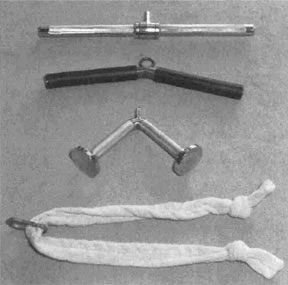 Четыре вида рукояток для выполнения разгибаний рук: прямая рукоять (недопустимо), рукоять с загнутыми вниз концами (плохо), V-образная ручка (лучше), пояс от халата (отлично). Как и во всех изолирующих упражнениях для трицепса - большинство из которых бесполезны, даже если они безопасны - не делайте разгибания на блоке по такой большой амплитуде, которая вынуждает Вас прижимать предплечья к бицепсам. Останавливайтесь до того, как предплечья и бицепсы соприкоснутся друг с другом. И никогда не расслабляйте мышцы в верхней точке. Сохраняйте напряжение мышц. В главе про тягу нижнего блока сидя Вы можете узнать, как Вы можете постепенно увеличивать нагрузку на тросовом тренажере.