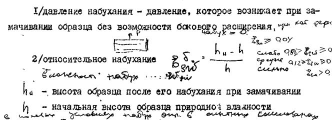 Набухание грунтов Набуханием называется процесс увеличения глинистых грунтов в объеме при замачивании. Обратным процессом является усадка грунта – уменьшение объема при уменьшении влажности (особенность глинистых минералов). Оба этих процесса приводят к деформациям различных сооружений. При замачивании набухающих грунтов возникает давление, которое воздействует на фундамент и ведет к деформациям сооружений. Усадка грунтов происходит по сооружениями с горячим технологическим режимом: печей, дымовых труб и т.д. Основные характеристики этих процессов: 1. Давление набухания – давление, которое возникает при замачивании образца без возможности бокового расширения 2. Относительное набухание