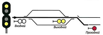 3) два желтых огня - разрешается поезду отправиться с железнодорожной станции с уменьшенной скоростью; поезд следует с отклонением по стрелочному переводу; перегон до следующей железнодорожной станции (путевого поста) свободен (рис. 30);