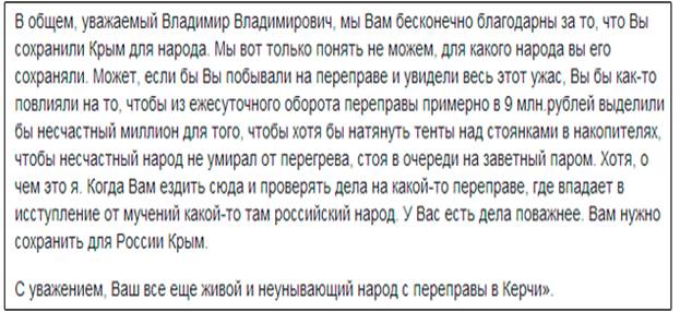 Как сообщают жители пробки на Керченскую переправу, 16 августа в пробке умер турист, житель Брянска - у 56 летнего россиянина попросту не выдержало сердце адской жары и стресса. https://www.baltinfo.ru/2014/08/16/V-ocheredi-na-Kerchenskoi-pereprave-umer-zhitel-Bryanska-443841 Более того, жители пробки отмечают, что за сутки до этого инцидента, им пришлось попрощаться с пожилой женщиной, которая умерла ожидая переправы с отдыха. https://www.facebook.com/esamozenova/posts/688888807832124 В очень гневной форме, российская журналистка Эвита Саможетова предлагает Путину и остальным членам правительства РФ постоять с ними в пробке: