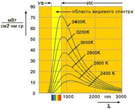 Все материалы при температуре выше абсолютного нуля имеют электромагнитное излучение за счет теплового движения атомов. Оно имеет непрерывный спектр, определяемый как функция температуры и эмиссии излучающего материала. В светотехнике температура источников света определяется по Кельвину (единица измерения " Кельвин" [K]). Инфракрасное излучение имеет нелинейную зависимость от температуры. Максимальные значения излучения смещаются с увеличением температуры в диапазон коротких волн (закон распределения Вина) Спектральная излучательная способность материала определяется коэффициентом эмиссии е, являющимся функцией длины волны и температуры. Он является отношением излучения материала к излучению абсолютно черного тела. Коэффициент эмиссии вольфрама, который используется для изготовления нити накала в галогенных лампах, имеет то преимущество, что его максимальное излучение находится в видимом спектре. Тепловое излучение материала, поглощающего все падающие на него излучения, зависит исключительно от его температуры. Идеальным является так называемое абсолютно черное тело.