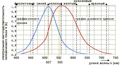Светом называется та часть спектра электромагнитного излучения, которую воспринимает глаз человека. Эта область находится между 380 нм и 780 нм. Видимый спектр электромагнитного излучения не имеет четких границ, поскольку они зависят от мощности излучения, которое достигает сетчатки и от чувствительности глаза наблюдателя. -- колбочки обеспечивают восприятия основных цветов (дневное зрение) с максимальной светочувствительностью в желто-зеленом диапазоне, при длине световой волны λ = 555нм (график дневного зрения V(λ)) -- высокочувствительные палочки обеспечивают черно-белое восприятие (ночное зрение), с максимальной светочувствительностью в зеленом диапазоне, при длине световой волны λ = 507нм (график ночного зрения V(λ)). V(λ) и V'(λ) спектральная светочувствительность человеческого глаза