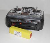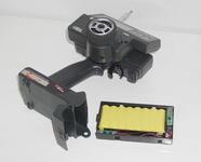 Передатчик аппаратуры радиоуправления состоит из корпуса, органов управления (джойстики, ручки, тумблеры и т.п.) платы кодера, ВЧ-модуля, антенны и батареи аккумуляторов. Кроме того, в компьютерном передатчике есть дисплей и кнопки программирования. Пояснения по корпусу и органам управления давались выше. На плате кодера собрана вся низкочастотная схема передатчика. Кодер последовательно опрашивает положение органов управления (джойстиков, ручек, тумблеров и т.п.) и в соответствии с ним формирует канальные импульсы РРМ (или РСМ) сигнала. Здесь же вычисляются все микширования и другие сервисы (экспонента, ограничение хода и т.п.). С кодера сигнал попадает на ВЧ-модуль и тренерский разъем (если он есть). ВЧ-модуль содержит высокочастотную часть передатчика. Здесь собран задающий кварцевый генератор, определяющий частоту канала, частотный либо амплитудный модулятор, усилитель-выходной каскад передатчика, цепи согласования с антенной и фильтрации внеполосных излучений. В простых передатчиках ВЧ-модуль собран на отдельной печатной плате и размещен внутри корпуса передатчика. В более продвинутых моделях ВЧ-модуль размещен в отдельном корпусе и вставляется в нишу на передатчике: