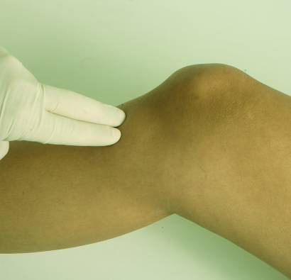 1) - Подложить под колено валик из полотенца, передняя поверхность ноги расположена наружу. - Локализовать место введения инъекции: Бугристость большеберцовой кости - Округлый выступ непосредственно под коленной чашечкой.