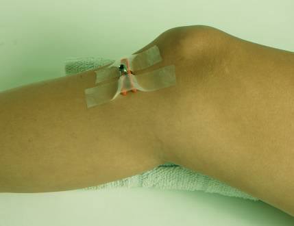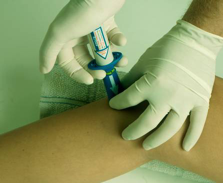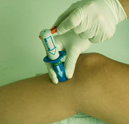 7) Плотно прижимая нижнюю часть устройства к ноге пациента, поместить два пальца второй руки под выступы цилиндра, а ладонь той же руки сверху на пистолет. Прижав шприц к выпрямленному колену, можно активировать пистолет B.I.G. Привести устройство в действие, медленно надавливая на поршень. Примечание: Нет необходимости сильно давить на поршень.