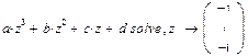 У даному випадку, нам прийшлось вводити невикористані до сих пір змінні u, v, оскільки змінні x і y уже визначені. Обійти ці труднощі досить просто, якщо рішати рівняння на новому робочому аркуші. Покажемо рішення для полінома третього порядку. a: =1 b: =1 c: =1 d: =1 Ми визначили раніше значення констант, в противному випадку рішення отримаємо в загальному вигляді і воно не вміститься на листі.