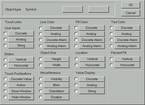 Все динамические связи можно разделить на две группы: Touch Links (левая колонка) и Display Links (три колонки справа). С помощью свойств Touch Links выполняется какой - либо ввод в систему. Свойства Display Links осуществляют вывод информации на экран дисплея. Нажатие на любую клавишу диалога (рис. 2.5) вызывает появление нового диалога для определения соответствующего свойства объекта. Количество диалогов соответствует количеству динамических свойств (кнопок) диалога выбора. Все диалоги различны, но большинство из них имеет общие характеристики: