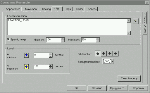 Диалог Свойства объекта содержит несколько закладок (рис. 2.12): Appearance (вид), Movement (перемещение), Scaling (масштабное изменение размеров), Fill (заполнение), Input (ввод), Slider (ползунок), Access (доступ). Нажатие любой из этих закладок выводит на экран соответствующий диалог для конфигурирования свойств объекта. Закладка Appearance определяет характеристики внешнего вида объекта: тип контурной линии (толщина линии, тип, цвет), цвет заполнения, тень и т. д. Здесь же определяется видимость объекта для оператора (объект может появиться на экране или исчезнуть в зависимости от выполнения некоторого условия). Объекты или группы объектов могут перемещаться в режиме исполнения (Runtime) при изменении значения переменной или выражения. По умолчанию при увеличении значения этого выражения объект перемещается вправо, а при уменьшении значения - влево. В диалоге Movement/Horizontal (горизонтальное перемещение, рис.2.12) предлагается определить переменную или выражение, вызывающее перемещение объекта (поле Movement Expression), его минимальное и максимальное значения (Minimum, Maximum), а также расстояния в пикселях, на которые будет перемещаться объект влево (Left) при принятии выражением минимального значения и вправо (Right) при принятии выражением максимального значения (поле Offset). Ширина объекта или группы объектов может динамически изменяться в режиме исполнения при изменении значения некоторого выражения. При увеличении/уменьшении значения выражения ширина объекта увеличивается/уменьшается, соответственно. В диалоге Scaling предлагается определить выражение, вызывающее изменение ширины объекта, его минимальное и максимальное значения, а также минимум и максимум ширины объекта в процентах от ширины нарисованного объекта. На закладке Fill определяются степень (уровень) заполнения объекта или его цвет в зависимости от значения выражения или переменной в режиме исполнения. На рис.2.13 приведен диалог Fill/Level (уровень заполнения), где предлагается определить переменную или выражение, определяющее изменение уровня в объекте (поле Level Expression), минимальное и максимальное значения (Minimum, Maximum) уровня, процент закрашивания объекта при минимальном и максимальном значениях уровня (поле Level), а также направление закрашивания объекта (кнопки Fill Direction).