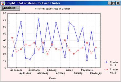 1. Graph of means представляє собою графічне зображення (рис.5.13) інформації міститься в таблиці, що виводиться при натисканні кнопку Analysis of Variance (аналіз дисперсії). На графіку показані середні значення змінних для кожного кластера.