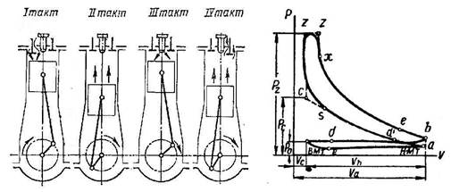 З представленого рисунка видно, що при першому такті поршень рухається від В.М.Т до Н.М.Т., клапан впускний відкритий, і циліндр буде наповнюватись повітрям. У дизелів з наддуванням повітря нагнітається з невеликим тиском 1, 5–2, 8 кг/см2 (0, 14-0, 27мПа), і у наслідок того, що випускний клапан на початку руху поршня від В.М.Т. якийсь час був ще відкритий, відбувається продувка циліндра. Цей такт називається тактом наповнення. На індикаторній діаграмі цей такт зображений лінією еа. Другий такт (стиск) відбувається при подальшому русі поршня від Н.М.Т. до В.М.Т. Впускний і випускний клапани при цьому закриті. У зв'язку зі зменшенням обсягу циліндра відбувається стискання повітря до 45–60 кг/см2 (4, 4–5, 9мПа), а температура стиснутого повітря досягає 6000 С. Наприкінці цього такту (у точці S на діаграмі) форсункою дизеля здійснюється впорскування палива. Паливо-повітряна суміш від високої температури самозапалюється, і починається процес горіння, в результаті якого температура у циліндрі досягає понад 20000 С, а тиск понад 100–120 кг/см2 (9, 8–11, 7мПа). Цей процес на індикаторній діаграмі виражений кривою s-z-z. У третьому такті при закритих впускних і випускних клапанах, гази що утворилися в результаті горіння, з великим тиском діють на поршень. Поршень починає рухатися від В.М.Т. до Н.М.Т., передаючи зусилля через шатун на колінчатий вал. Цей такт називається робочим ходом, тому що саме в цьому такті відбувається корисна робота. В міру руху поршня обсяг у циліндрі збільшується, а тиск падає. Характер падіння тиску показаний на індикаторній діаграмі лінією zb. Четвертий такт робить випуск продуктів згоряння з циліндра, і називається тактом випуску. При цьому поршень рухається від Н.М.Т, до В.М.Т. з відкритим випускним клапаном (лінія bd на індикаторній діаграмі). До приходу поршня у В.М.Т. відкривається впускний клапан, (крапка d на діаграмі) і до закриття випускного клапану, після проходження поршнем В.М.Т. (крапка е на діаграмі), відбувається продувка циліндра, тобто очищення від залишків продуктів згоряння. На цьому робочий цикл у циліндрі закінчується, і далі процес повторюється. Таким чином один робочий цикл відбувається за два обороти колінчатого вала або чотири ходи поршня, тобто за чотири такти.