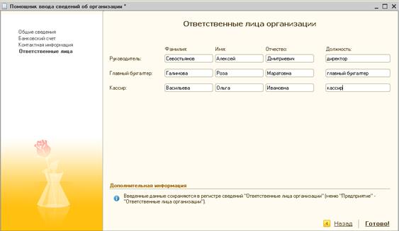 Руководитель: Севостьянов Алексей Дмитриевич, директор Главный бухгалтер: Галимова Роза Маратовна, главный бухгалтер Кассир: Васильева Ольга Ивановна, кассир