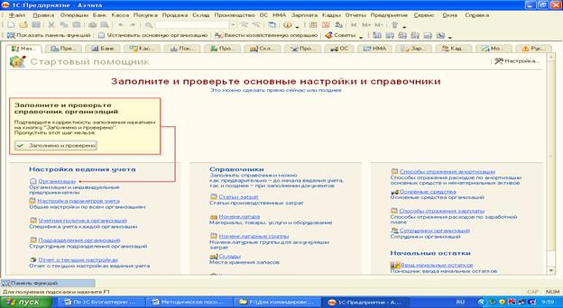 Кнопка «ОК». В том случае, если ведется учет по нескольким организациям, одну из них можно установить в качестве основной организации (кнопка «Установить основной»). На панели функций нажать кнопку «Заполнено и проверено». Следующим шагом программа предлагает проверить 7. «НастройкА параметров учета».