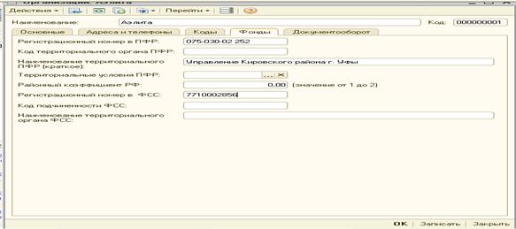 Вкладка «Фонды»: Регистрационный номер в ПФР – 075-030-02 252 Наименование территориального ПФР – Управление ПФР № 32 Территориальные условия ПФР – не заполняем Районный коэффициент РФ – 1, 15 ( 15% уральские) Регистрационный номер в ФСС - 7710002856