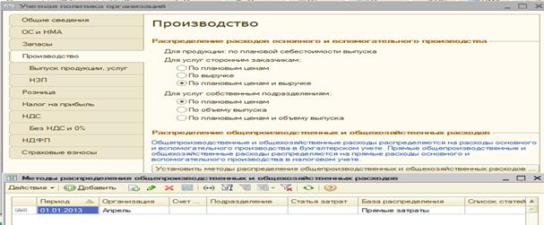 Закладка «Производство» Распределение расходов основного и вспомогательного производства: Для услуг сторонним заказчикам: ¤ По плановым ценам и выручке Установить «Методы распределения общепроизводственных и общехозяйственных расходов» Кнопка «Добавить» Период – 01.01.2015 База распределения – Прямые затраты