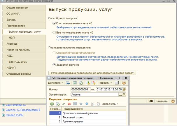 Закладка «Выпуск продукции, услуг» Указывается, как учитывается выпуск готовой продукции – «С использованием счета 40» (по нормативной (плановой) себестоимости) или «Без использования счета 40» (по фактической производственной себестоимости непосредственно на счете 20). Способ учета выпуска - «С использованием счета 40 » Можно установить способ последовательности закрытия счетов затрат – «Задается вручную» или автоматически. Для указания порядка подразделений вручную предназначен документ «Установка порядка подразделений для закрытия счетов затрат», который можно открыть с помощью одноименной гиперссылки. Кнопка «Добавить» Для автоматического заполнения табличной части следует нажать кнопку «Заполнить». Последовательность подразделений устанавливается с помощью кнопок é ê. Установить следующую последовательность: «Производственный участок», «Торговый отдел», «Администрация». ОК