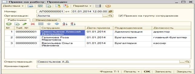 Организация – Аэлита Вид занятости – Основное место работы ОК (До тех пор, пока не будет оформлен документ «Прием на работу» в графе «Состояние» будет установлено значение «Не принят(а)») Кнопка «Добавить» Галимова Роза Маратовна Вид занятости - Основное место работы ОК Кнопка «Добавить» Васильева Ольга Ивановна Вид занятости – Основное место работы ОК 13.11 «Приказ о приеме на работу» (Кадры – Прием на работу) Дата – 01.01.2015 Вкладка «Работники» Кнопка «Добавить» Сотрудник – Севостьянов А.Д. Дата приема – 01.01.2015 Подразделение – Администрация Должность – директор Вид расчета – оклад по дням Размер оклада – 45000 руб.