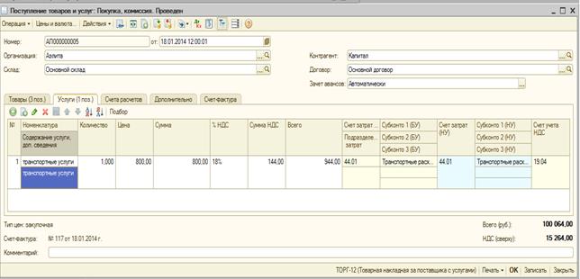 Иногда приобретение товаров связано с оплатой дополнительных расходов. Например: доставка, разгрузка. В этом случае оформляется документ «Поступление доп.расходов», если услугу оказывает другой поставщик. «Поступление доп.расходов» (Покупка – Поступление доп.расходов) Этот документ можно ввести на основании документа «Поступление товаров и услуг». В документе нажать кнопку «Цены и валюта» þ - Сумма включает НДС ОК Сумма – 900 руб. Способ распределения – по сумме Содержание – доставка Вкладка «Товары» Табличная часть заполнена данными из документа «Поступление товаров и услуг» Вкладка «Счета расчетов» При необходимости можно изменить счета учета расчетов с контрагентом. Кнопка «Провести». Вкладка «Счет-фактуру» þ - Предъявлен счет-фактура Вх. № - 117 вх. дата – 18.01.2015 ОК. Посмотреть проводки По сформированным проводкам видим, что сумма доставки распределяется пропорционально сумме по каждому наименованию на счет учета товаров. Если услуга оказывается тем же поставщиком, то можно в документе «Поступление товаров и услуг» заполнить вкладку «Услуги» (счет затрат 44.01)