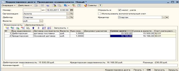 Табличная часть заполняется автоматически всеми договорами контрагента, по которым есть остатки. Взаимозачет производится на сумму 15930 руб. Для этого откорректировать сумму долга по строке «Кредиторская задолженность».