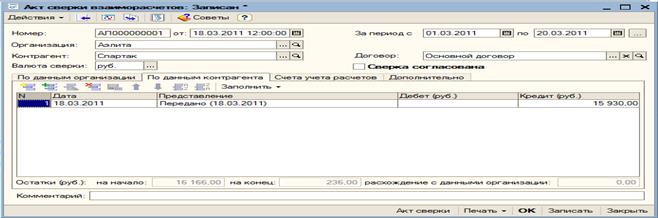 Остатки на начало и на конец периода отражаются в нижней части вкладки. Вкладка «По данным контрагента» Ее можно заполнить вручную или автоматически Кнопка «Заполнить» - «Заполнить по данным организации» Вкладка «Дополнительно» Представитель организации – Галимова Р.М. (сотрудник организации, ответственный за проведение сверки) Если сверка производится по всем договорам сразу, в разделе «Печатная форма» можно установит þ - «Разбить по договорам». Для защиты документа от случайных изменений можно установить þ - «Сверка согласована» Кнопка «Записать», «Печать». ОК. Акт сверки не формирует никаких проводок.