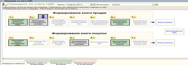 Для упрощения отражения регламентных операций по учету НДС можно воспользоваться обработкой «Помощник по учету НДС» (Продажа (Покупка) – Ведение книги продаж (покупок) – Помощник по учету НДС) Период - 1 квартал 2015 Организация – Аэлита Регламентные операции отражаются в том порядке, в котором их следует выполнять. Текущая регламентная операция обозначается стрелкой. Каждая регламентная операция обозначается цветом, соответствующим ее текущему состоянию.