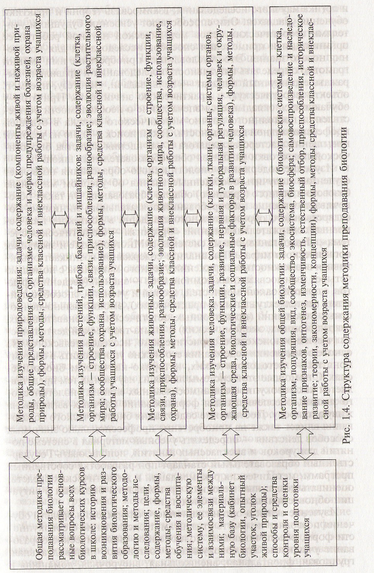 и логика научного исследования; взаимосвязь теории и практики обучения учащихся. Они способствуют усвоению будущими учителями теоретических основ методической научной работы, ее организации и применения способов исследования для получения нового знания. Это обусловливает приобретение ими умений грамотно определять актуальность исследования и правильно выражать его научный аппарат — цель, задачи, гипотезу, предмет, объект, теоретическую и практическую значимость. При этом у обучающихся складывается впечатление о необходимости осуществления постоянного научно-методического поиска в будущей профессиональной деятельности. Такой поиск — одно из условий повышения мастерства педагога и улучшения качества биологической подготовки учащихся общеобразовательных школ. Изучение содержания биологического образования позволяет студентам получить обобщенные знания об учебном материале базового и полного (среднего) общего образования. Он также обеспечивает освоение ими требований обязательного минимума Государственного образовательного стандарта в контексте трех основных содержательных линий: «Организм — биологическая система», «Надорганизменные системы», «Многообразие и эволюция органического мира». При анализе содержания возникает объективная возможность в выражении учебного материала с помощью четырех взаимосвязанных компонентов — знаний (сведений, фактов, понятий, закономерностей, теорий и учений), способов действия (интеллектуальных и практических), эмоционально-ценностных отношений (нравственных, эстетических, познавательных, рекреационных, экономических) и опыта творческой деятельности (частично-поискового, эвристического, исследовательского). На основе осмысления содержания его можно упорядочить в систему понятий — методологических, историко-научных и биологических. С помощью этой системы любая из изучаемых тем представляется как совокупность взаимосвязанных единиц биологического знания, обеспечивающая формирование научных взглядов на живую природу. Постижение содержания биологического образования влияет также на приобретение профессионально значимых способов действия — определять учебный материал в системе понятий для уроков и внеклассных занятий, использовать Государственный образовательный стандарт при разработке собственных программ, методических рекомендаций и дидактических средств, оценивать созданные методики преподавания биологии в ситуации обновления школьной биологии. Изучение аспекта организационного оформления средств обучения позволяет получить студентам представление о совокупности форм, обеспечивающих полноценное биологическое образование учащихся. Эту совокупность составляют индивидуальная, групповая, фронтальная, внешкольная, внеурочная, домашняя и самостоятельная работы, экскурсии, полевые практикумы и урок. Особую ценность имеют знания об уроке биологии, ибо он в наиболее полном составе может представлять все компоненты процесса обучения — целевой, содержательный, процессуальный и контрольно-оценочный. Поэтому в рамках общей методики преподавания биологии отражаются такие важные характеристики урока, как функции (образовательная, воспитательная, развивающая, информационная, эвристическая, корректирующая, контрольно-оценочная), содействующ