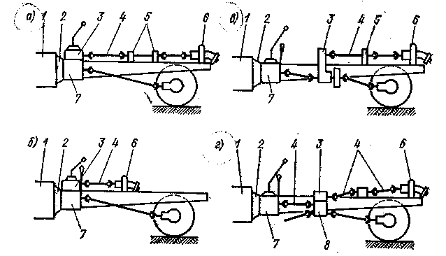 Рис.4 Схема компоновки дополнительных трансмиссий: а, б — вариант I; в — вариант II; г — вариант III: 1 — двигатель; 2 — сцепление; 3 — коробка отбора мощности; 4 — карданный вал; 5 — опоры; 6 — пожарный насос; 7 — коробка передач; 8 — раздаточная коробка Вариант - 1(рис 4б) на пожарных автомобилях АЦ-40(131)-153, АЦ-40 (375)-Ц1, АЦ-40 (375)-Ц1А, АЦ-40 (133Г)-181 и АНР-40 (131)-27А. Отличительной особен-ностью такой схемы является более укороченная длина карданной передачи, не имеющей промежуточной опоры. В обеих схемах варианта I крутящий момент от двигателя 1 пере-дается через механизм сцепления 2, коробку передач 7, коробку отбора мощности 3, кардан-ную передачу 4 и вал пожарного насоса 6. Карданная передача при заднем расположении на-соса имеет две промежуточные опоры 5. На всех пожарных автомобилях, выполненных на шасси ЗИЛ, устанавливают КОМ-68Б, а на шасси «Урал» КОМ-Ц1А; Вариант -11(рис.4в) осуществляют на автоцистернах АЦ-~30(53А)-106А и 106Б, монтируемых на шасси ГАЗ с колесной формулой 4 X2. Мощность от двигателя 1 к валу насоса передается через механизм сцепления 2, коробку перемены передач 7, коробку отбора мощности 3 и далее через два карданных вала 4, соединенных на вал насоса 6. Карданная передача от коробки отбора мощности к валу насоса имеет промежуточную опору 5; Вариант III представлен на(рис.4 г). Такую схему применяют, как правило, на всех пожар-ных автомобилях, монтируемых на шасси повышенной проходимости с колесной формулой 4х4 Например, на АЦ-30(6б)-146 пожарный насос 6 приводится в действие от двигателя через механизм сцепления 2, коробку передач 7, карданный вал 4, раздаточную коробку 8, коробку отбора мощ-ности 3. 5. АЦ 3, 0 -40(4331) с дизельным двигателем Автоцистерна пожарная АЦ 3.2- 40 ЗИЛ-4333 предназначена для тушения пожаров в населенных пунктах, на промышленных предприятиях, в сельской местности и других объектах и служит для доставки к месту пожара боевого расчета, пожарно-технического вооружения и запаса огнетушащих веществ.
