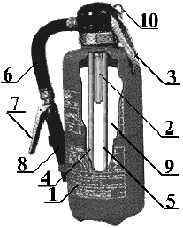 1 — корпус 2 — газовый баллончик 3 — рычаг запорно-пускового устройства 4 — сифонная трубка 5 — трубка подвода рабочего газа в нижнюю часть корпуса огнетушителя 6 — шланг 8 — насадка (ствола) 9 — заряд порошка