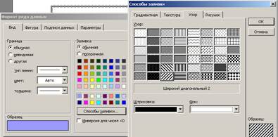 · Щелкните ПКМ по первому столбику (сиреневому) и выберите Формат рядов данных. · Выберите Способы заливки, закладку Узор, Штриховка – чёрный, Фон – белый, Узор – широкий диагональный.