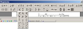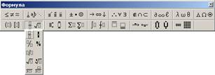 · Математические знаки, формулы. · Перейдите на страницу Приложение 5. · Создайте документ по образцу. 1. Установите курсор в то место, где необходимо поместить формулу. 2. Запустите редактор формул(Вставка / Объект / Microsoft Equation 3.0). 3. Создать формулу. 4. Завершить ввод формулы нажатием клавиши ESC или щелчком левой кнопкой мыши где-либо в поле документа вне области ввода формулы. После вызова редактора формулпоявляется пиктографическое меню, состоящее из двух строк кнопок. Первый ряд служит для вставки символов (операторов и греческих букв) в формулы, второй — для создания шаблонов математических формул.