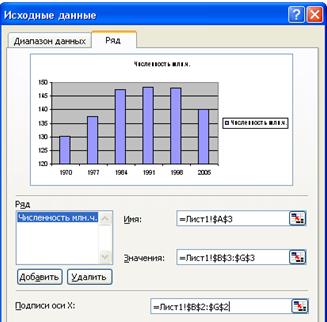 ЛАБОРАТОРНАЯ РАБОТА №5. Технология работы с электронными таблицами, на примере MS EXCEL. Графическое представление результатов. Анализ полученных результатов Цель занятия: изучение технологии использования возможностей Microsoft Excel для статистических расчетов, графического представления данных и прогнозирования. Задание 1. С помощью диаграммы (обычная гистограмма) отобразить данные о численности населения России (млн. чел.) за 1970—2005гг. Исходные данные представлены на рис.1. 1. Откройте редактор электронных таблиц Microsoft Excel. 2. Создайте на листе 1 таблицу численности населения по образцу.