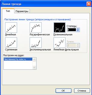 Для ввода значений лет создайте ряд чисел с интервалом в 7 лет (введите первые два значения даты — 1970 и 1977 г., выделите обе ячейки и протяните вправо за маркер автозаполнения до нужной конечной даты). 3. Постройте диаграмму по данным таблицы. Для этого выделите интервал ячеек с данными численности населения A3: G3 и выберите команду Вставка/Диаграмма. На первом шаге работы с Мастером диаграмм выберите тип диаграммы — гистограмма обычная; на втором шаге на вкладке Ряд в окошке Подписи оси Х укажите Задание 2. Осуществить прогноз численности населения России на 2012 г. добавлением линии тренда к ряду данных графика 1. Добавьте линию тренда к диаграмме, построенной в задании 1. Для этого сделайте диаграмму активной щелчком мыши по ней и в меню Диаграмма выберите команду Добавить линию тренда. 2. В открывшемся окне Линия тренда на вкладке Тип выберите вид тренда — полиномиальный 4-й степени.