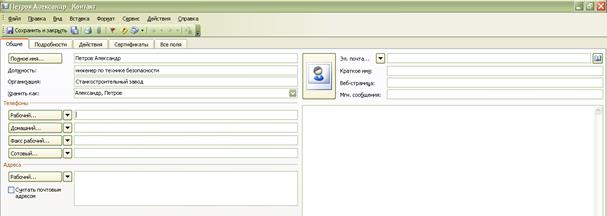 7. В поле Текст подписи введите «С наилучшими пожеланиями». 8. Выделите фразу и нажмите кнопку Абзац. 9. В появившемся окне выберите По правому краю. Нажмите ОК, затем Готово. Задание 5. Создание и организация списка контактов Список Контакты следует воспринимать как мощное электронное средство хранения информации, необходимой для оперативной связи с людьми, которое обеспечивает также удобное управление контактами. Для каждого контакта можно хранить следующую информацию. ¾ Имя, должность и название компании. ¾ Рабочий, домашний и другие адреса. ¾ Рабочий, домашний номер телефона, номер факса, номер мобильного телефона, номер пейджера и др. ¾ Адреса электронной почты, адреса веб-страниц и адреса мгновенных сообщений ¾ Информация о месте работы, включая отдел, офис, специальность, имя менеджера и ассистента. ¾ Личные данные ¾ Сервер каталогов и псевдоним электронной почты ¾ Адрес информационного сервера сведений о доступности контакта Можно создать запись контакта с указанием одного лишь имени либо добавить всю необходимую информацию. Можно указывать общие заметки и отслеживать все действия Outlook, связанные с каждым из контактов. Можно добавлять или изменять информацию о контакте в любое время. 1. В области Область переходов разверните папку Контакты отобразится содержимое учебной папки с адресными карточками для каждого контакта. 2. На панели инструментов нажмите кнопку Создать контакт, появится новая пустая форма контакта. 3. В поле Полное имя введите «Петров Александр». 4. В поле Должность введите «Инженер по технике безопасности». 5. В поле Компания введите «Станкостроительный завод».