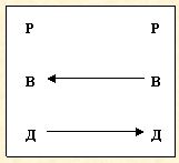 Предположим, что в предыдущей ситуации сотрудница выразила свое несогласие более решительным образом: " Как не стыдно такое предлагать? А работать кто будет?! " Это явно позиция Родитель и трансакция Д< -Р (" Босс"), что и отображено на рис. 9. Конфликтность данного ответа очевидна. На приведенной схеме сила этого кофликтогена иллюстрируется, во-первых, значительным расхождением позиций (на 2 ступени у адресата), и, во-вторых, ярко выраженной пристройкой сверху.
