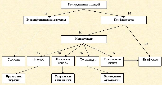 Трансактный анализ для процесса общения может сыграть примерно такую же роль, как дифференциальное исчисление для анализа нестационарных физических процессов. В обоих случаях можно вести речь о том, как по изменениям в малом сделать выводы об окончательных результатах анализируемых процессов, то есть дать их прогноз. В нашем случае речь идет о процессе протекания беседы. Покажем, что участник беседы может с помощью знания соответствующих трансакций: 1) задать взаимное распределение позиций, отвечающее его целям; 2) прогнозировать результат беседы, получив лишь ответную реакцию на предложенное распределение. На приводимой далее схеме самый верхний блок означает распределение позиций, задаваемых инициатором общения с целью достичь нужного ему результата. Дальнейшее развитие беседы и ее результат зависят от того, примет ли адресат предложенное распределение позиций. 1а. Если оно устраивает партнера, то возникает комфортное, бесконфликтное общение, ведущее к согласию. 1б. Если предлагаемое партнеру распределение не отвечает его интересам, то это является конфликтогеном. В этом случае возможны два варианта: 2а. Распределение принимается; это создает условия для манипулирования партнером. 2б. Предложенное распределение отвергается; это ведет к временному ухудшению отношений, а если инициатор не откажется от своих намерений, то и к конфликту. В случае 2а дальнейшая коммуникация может пойти четырьмя различными путями. Исход ее зависит от способности адресата осознать, что им манипулируют. 3а. Если адресат не осознает опасности или не знает, как защититься, то манипулятор достигает своей цели. Адресат может и сознательно идти на проигрыш, когда у него нет другого выхода (например, когда он зависим от манипулятора и/или не хочет ухудшать отношения), сделать " хорошую мину при плохой игре". 3б. Адресат осуществляет пассивную защиту — делает вид, что не понял, не расслышал, переводит разговор на другую тему. Результат — ничья, сохранение отношений на прежнем уровне с некоторым психологическим преимуществом защитившегося.